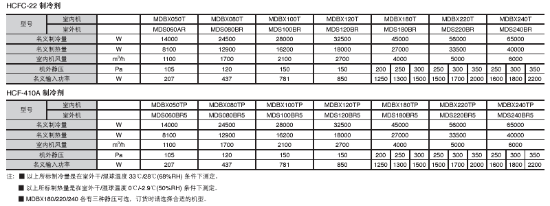 型號:MDBX050T~MDBX240T MDBX050TP~MDBX240TP 制冷量:14~65kW 制熱量:8.1~40kW 制冷劑:HCFC-22 HFC-410A 風量:1100~6000m3 /h